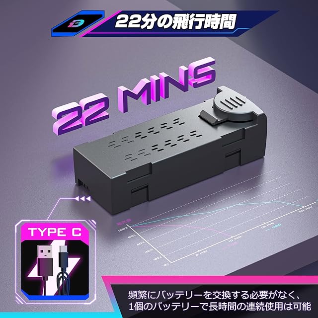 【22分の飛行時間】長持ちのバッテリーを付属されています。満充電の場合、22分飛行できます。頻繁にバッテリーを交換する必要がなく、1個のバッテリーで長時間の連続使用は可能です。安全性、使用感、携帯性、利便性を考慮しているD60は空撮初心者に最適なオールラウンドタイプのドローンとなります。