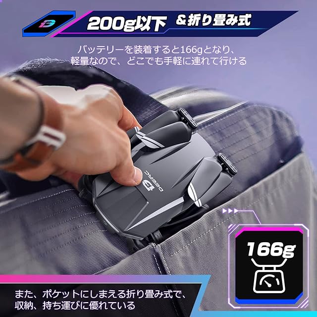 【軽量&折り畳み式】高画質の空撮機なのに、バッテリーを装着すると166gとなり、とても軽量です。また、ポケットにしまえる折り畳み式なので、収納、持ち運びに優れています。遠いところに旅行にしたり、遠足したりする際に、当製品を手軽に連れて行けます。どこに行ってもその美しい風景を当製品で記録できます。