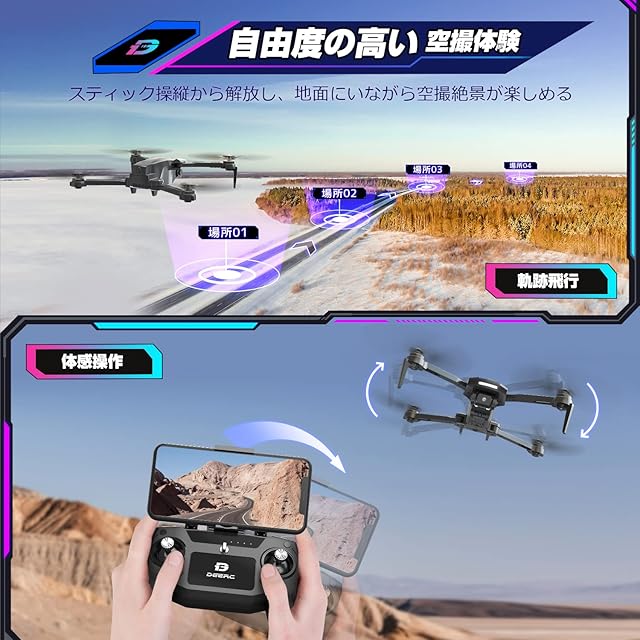 【自由度、安心感のある飛行】緊急停止と低電力アラームなどの安全確保機能を備えるため、機体紛失、障害物にぶつかるリスクを減らすことができます。体感操作、軌跡飛行などの機能で、スティック操縦から解放し、地面にいながら空撮絶景が楽しめます。様々なスマート機能のほか、安全技術も備えたので、ドローン初心者に安全なドローン飛行を提供し、空撮初心者でも高品質な空撮を簡単に楽しく安全に、プロのような映像を撮影することができます。
