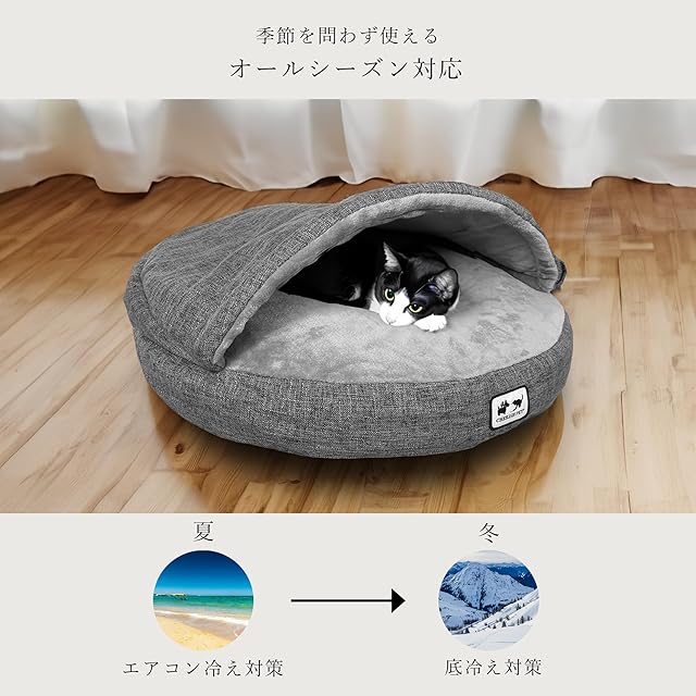 デザイン:かまくら型のベッドで、犬や猫が中に入ることで本能的に落ち着くデザインとなっています。